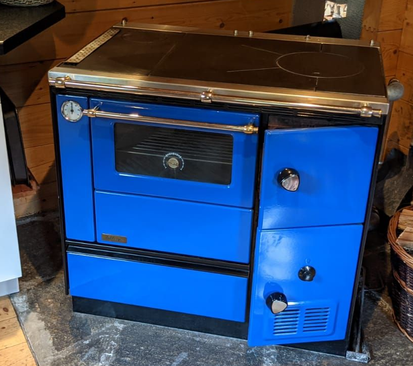 Unser blauer Lohberger-Holzherd ist an das Heizsystem der Hütte angeschlossen und lädt einen Pufferspeicher.